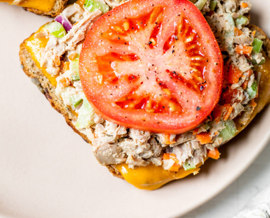 Diner comfort food just got a makeover! This classic tuna melt has the perfect amount of crunch, melty cheddar cheese, and veggies. Melts are one of my favorite types of lunch sandwiches. If you love a hot sandwich, you should also try these Open-Faced Turkey Melts and Egg and Tomato Breakfast Melts. If you want a cold sandwich, definitely check out my Open Faced Tuna Sandwich with Avocado.