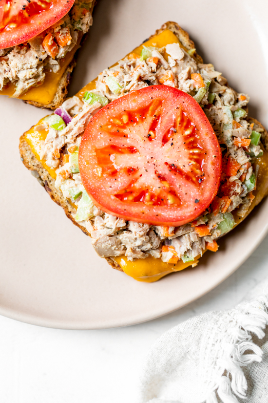 Adding veggies to your tuna and serving it open-faced makes this classic sandwich healthier and lighter! By using only one slice of bread, you cut the carbs in half. For a more low-carb tuna melt, try these tomato tuna melts.