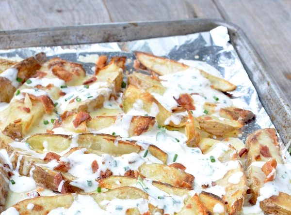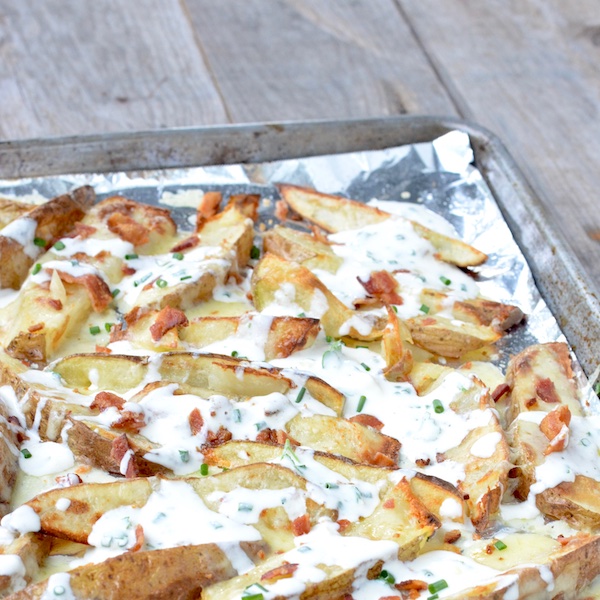 I haven’t had cheese fries in so long that I forgot how good they are. And now we can enjoy them without the deep-fried heaviness from your typical restaurant version. There’s no reason not to indulge in tasty oven-baked potatoes, organic cheese & bacon, and homemade ranch dressing … yum!