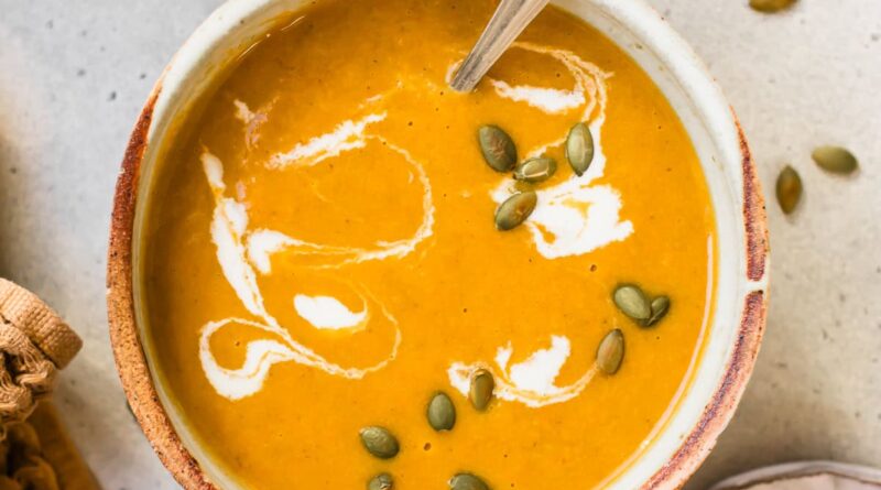 Pureeing the vegetables at the end makes this pumpkin soup creamy without adding any cream or dairy. See the recipe card at the bottom for printable directions.