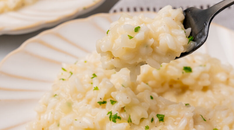 It is made by slowly cooking Arborio rice in broth. Arborio rice is a short-grain Italian rice variety. The rice is cooked until it becomes tender or al dente.