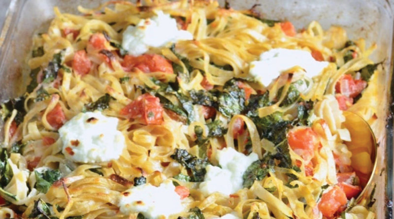 Add the garlic mixture and pasta to the the baking dish and then toss to combine with the tomatoes and shallots. Mix in the kale until well combined. Spoon the remaining ricotta in dollops on top, along with a little more salt and red pepper, and bake for 10 minutes more, until heated all the way through.
