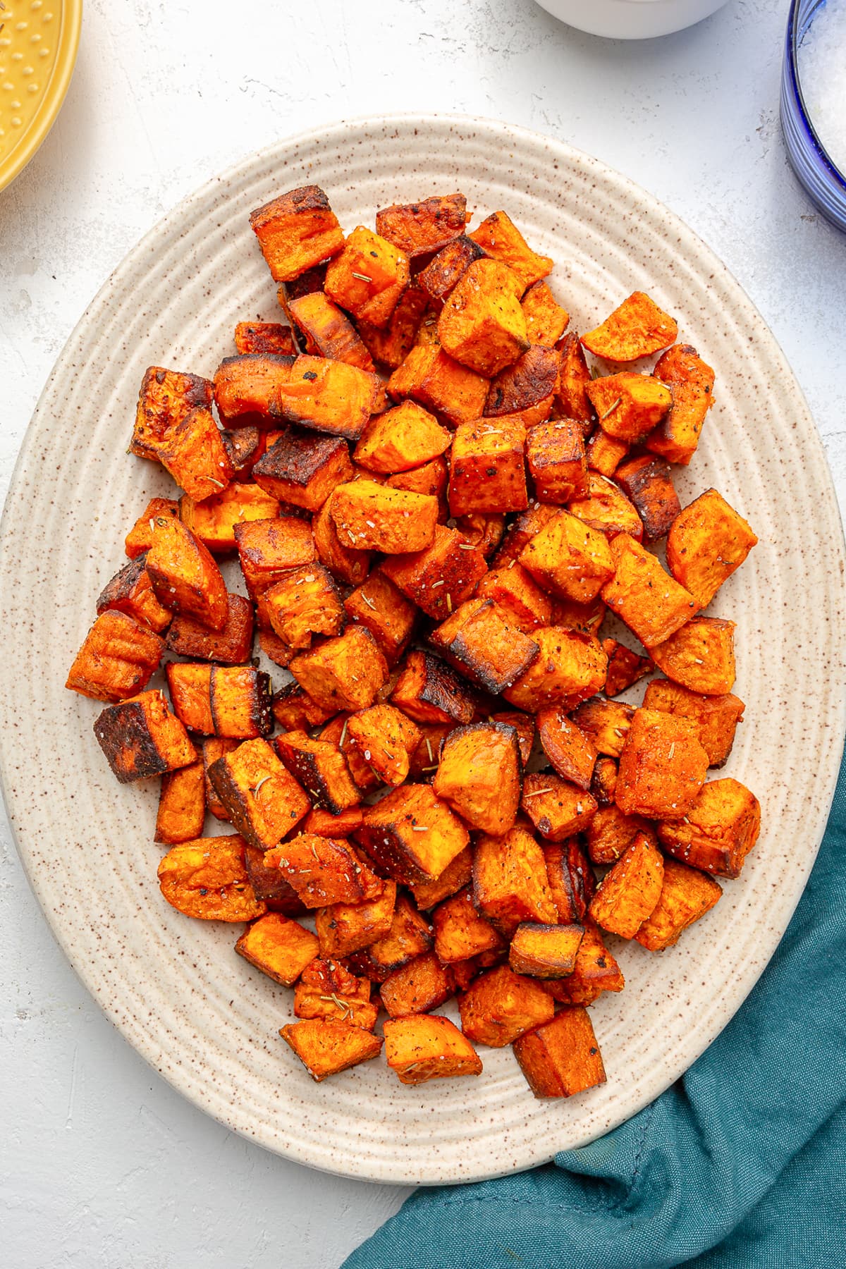 These healthy oven-roasted sweet potato cubes are a versatile side dish for so many meals:
