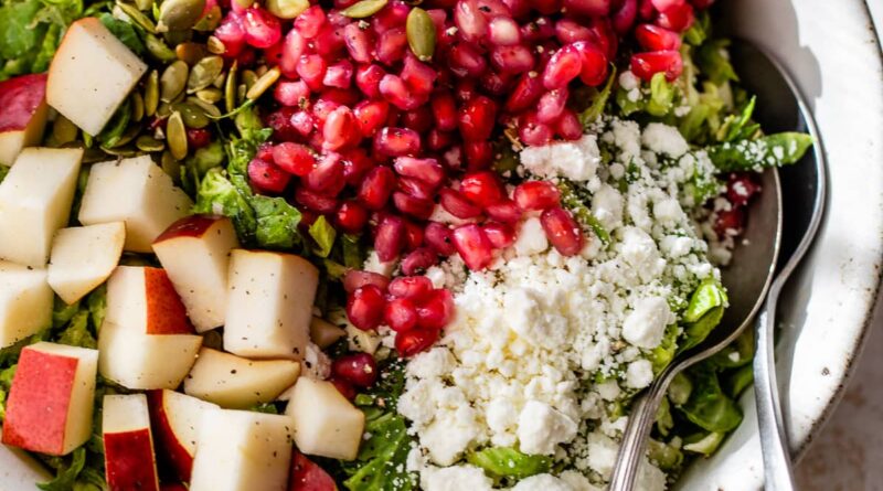 - Assemble the Salad: Top the sprouts with pears, pomegranates, pepitas, and goat cheese.
