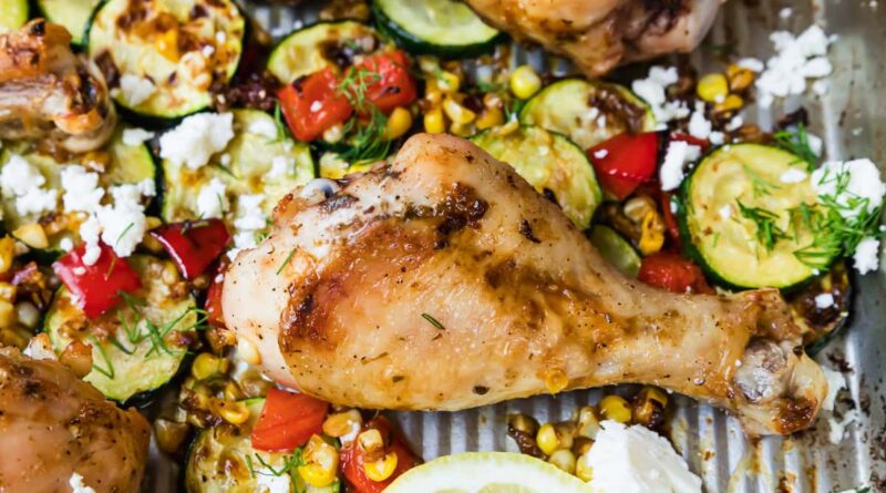 Sheet Pan Chicken Drumsticks with Zucchini, Lemon, Corn and Feta