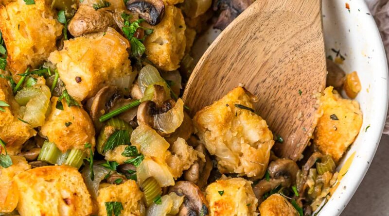 • Bake: Lightly spray a 9×13-inch baking dish with oil. Transfer the stuffing to the prepared dish. Cover with foil and bake at 350°F for 25 minutes. Uncover and bake for an additional 15 minutes, until the top is golden and slightly crisp.