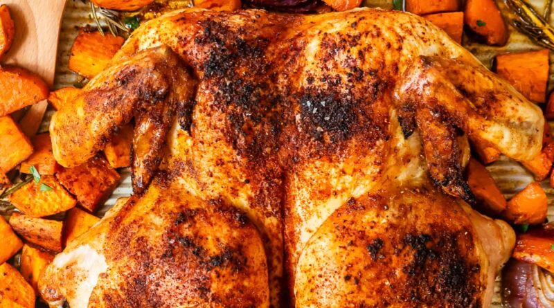 Spatchcocking a chicken may sound intimidating, but it’s actually very easy—and the payoff is worth it. Removing the backbone and flattening the bird allows it to cook more evenly and quickly. You can even ask your butcher to do it for you. The result? Juicy chicken with crispy skin and tender, caramelized sweet potatoes, all done in under an hour.