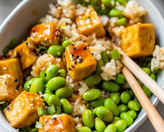 • When the tofu is ready, toss it with the sauce to coat until evenly covered. Serve immediately over rice with edamame, sesame seeds and scallion greens.