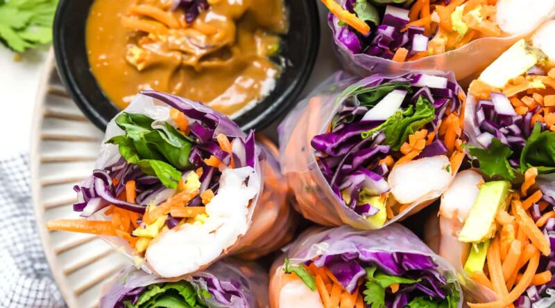 I love these fresh homemade Vietnamese-style summer rolls filled with shrimp, avocado, raw veggies and fresh herbs plus a delicious peanut hoisin dipping sauce.