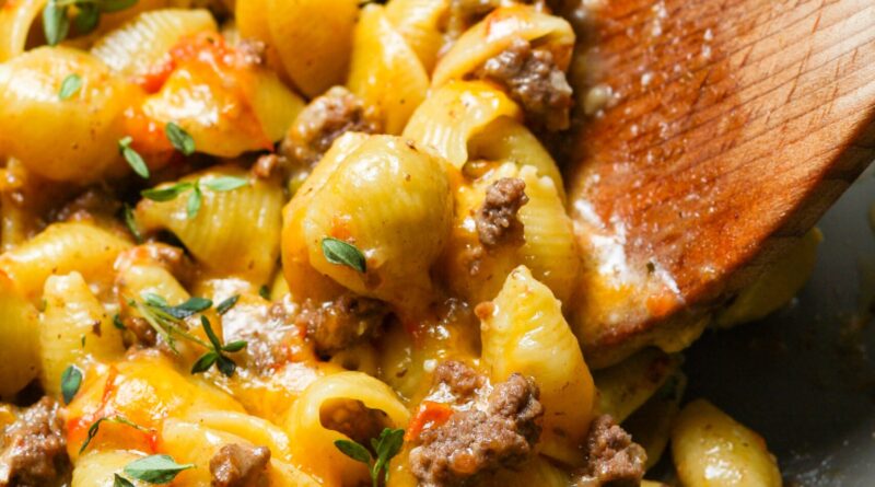 Rich and creamy taco pasta with a flavorful kick! This one pot recipes features savory seasoned beef, tender pasta shells, and a gooey, cheesy sauce. It is the ultimate comforting meal for the whole family!