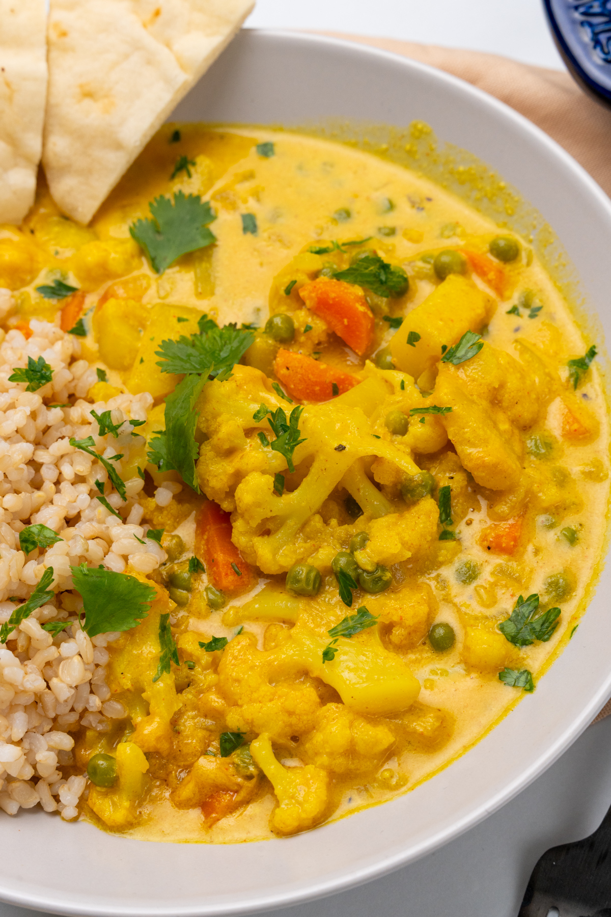 Carrots, peas, potatoes, and cauliflower are great for this korma dish. Feel free to omit one of these if desired.