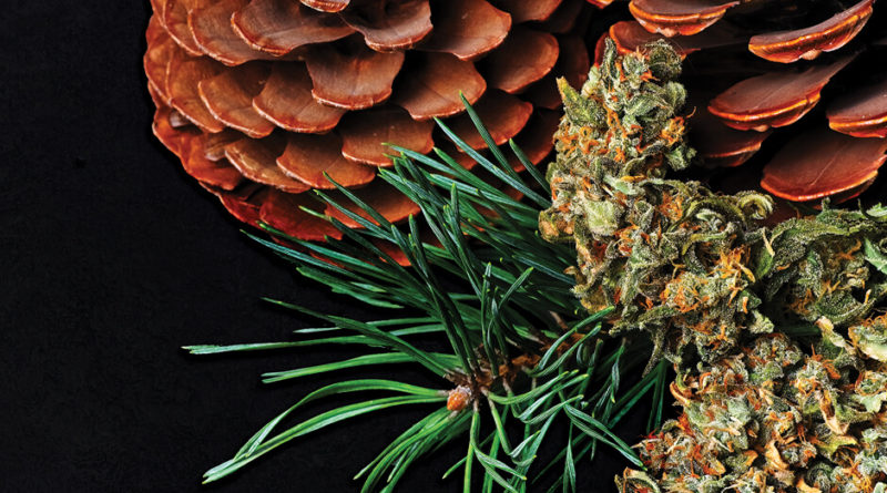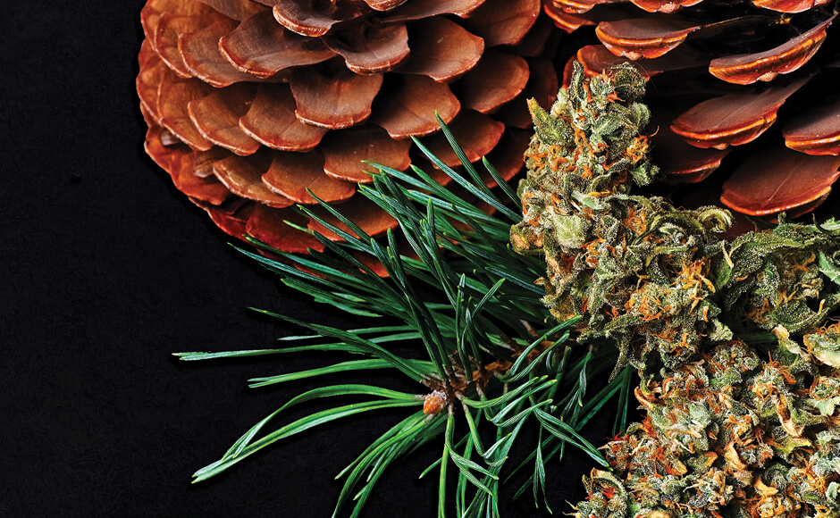 Cannabis flower on a table with pine needles and cones.Pinene is considered a major terpene. It produces a distinctive pine-like aroma. – Gleti / Shutterstock
