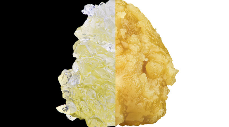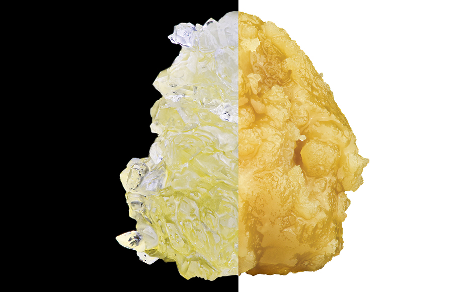 Left: Platinum Russian Stomper live resin courtesy of Kind Selections. Right: El Chapo live rosin courtesy of Kind Selections. Photo credit: Kyle LeGrow