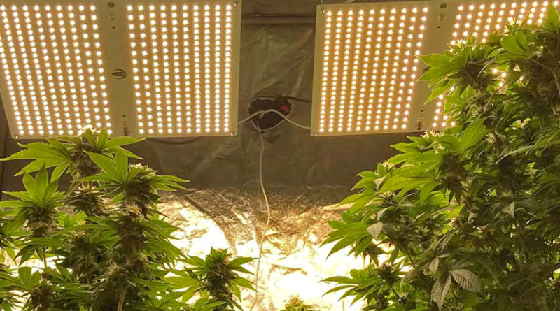 Cannabis plants in a grow tent under and LED light.