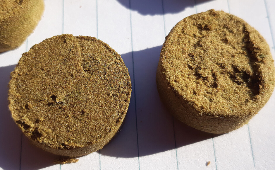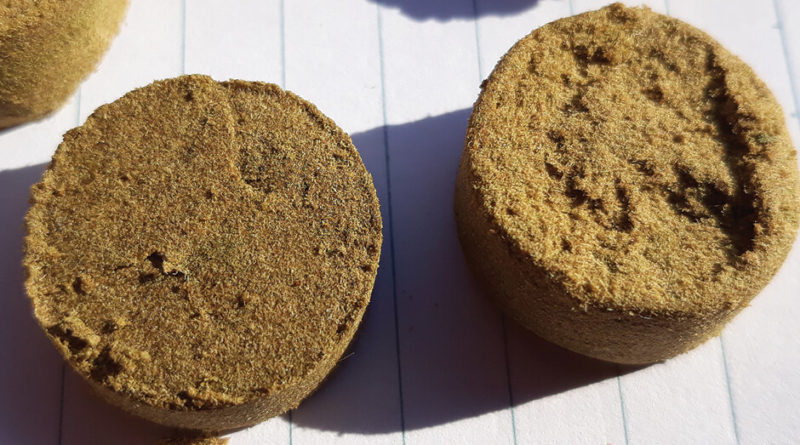 In practice one-gram and two-gram hash coins are relatively simple to press, but the much chunkier five-gram hash pucks are quite challenging to press by hand.