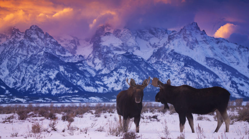 Two bull moose stand under the Tetons during a winter sunset in Grand Teton National Park, Wyoming.
