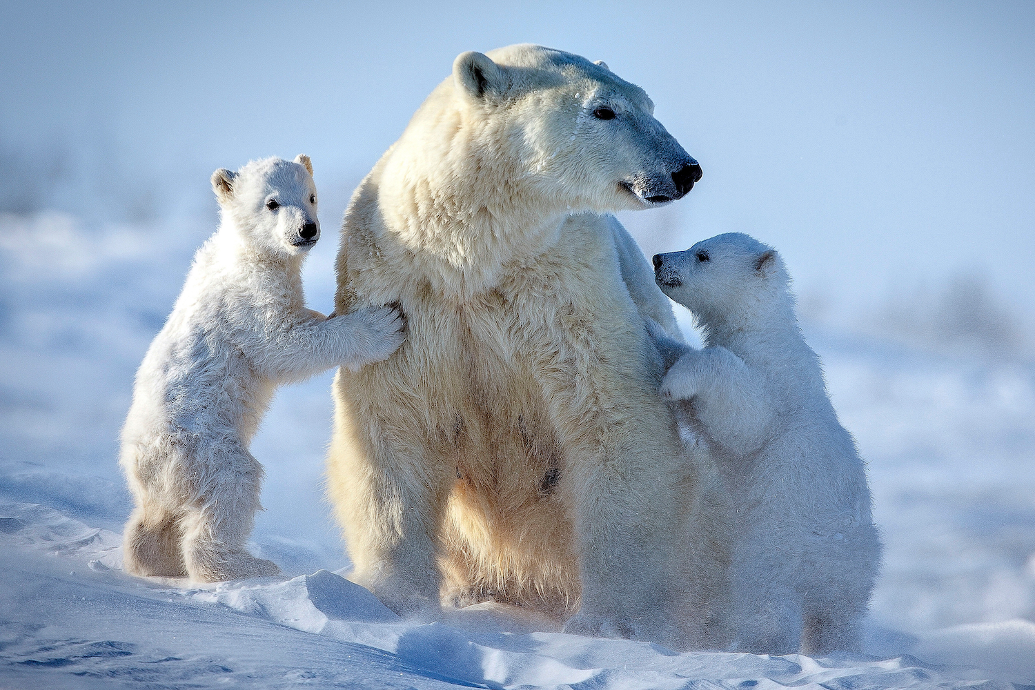 For the next two-and-a-half to three years, the mama bear teaches her kids how to hunt seals, swim in the Arctic waters, and quite simply survive.