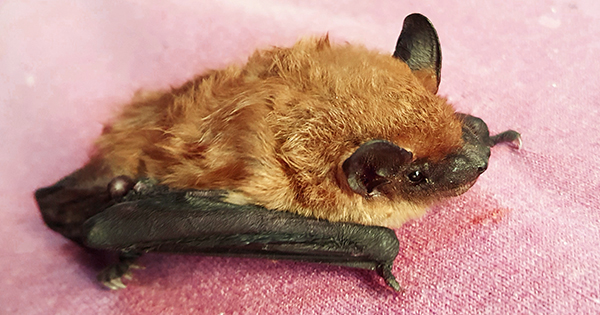 A big brown bat “hanging out.” Often when found outside, big brown bats sit in this position on the side of a building, tree or (ideally not) on the ground. (Photo by Sarah Ludlow/NCC)