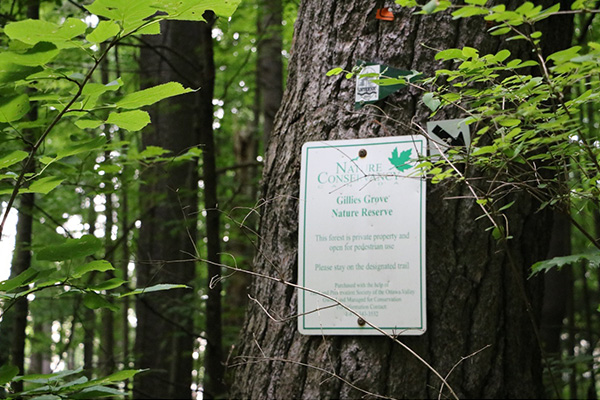 Asha: Gillies Grove is an old-growth forest. This describes a forest that has gone a century or more without major disturbances, like clearcutting or wildfires. Because the forest here has been designated as an NCC property, the plant life in Gillies Grove has been able to flourish. Trees in the grove are everywhere, providing continuous shade throughout the forest. The trees are so lush and plentiful that it’s easy to forget you’re near the centre of the town of Arnprior. Eastern white pine are plentiful in Gillies Grove, but that’s not the only type of plant. Sugar maples, American beech, hepatica flowers, ghost pipes, violets, red and white trilliums (and the occasional poison ivy) are everywhere. As with any forest, there are dead trees and hollowed-out trunks on the ground. Dead trees provide habitat for insects, birds, fungi and other wildlife essential for the ecosystem’s balance. As of 2015, the highest tree in Ontario also stands in Gillies Grove. Reaching approximately 47 metres in height, the eastern white pine tree is an amazing sight to behold. Seeing these trees was a great reminder of how many species live in and depend on these types of forests.