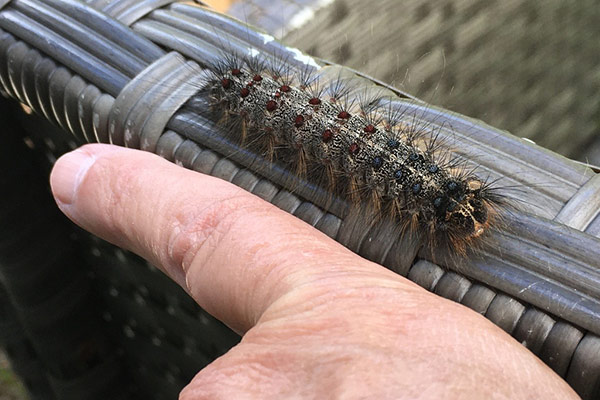 First of all, do not handle the caterpillars with bare hands. Some people develop an itchy rash from touching the caterpillars’ tiny hairs, which contain histamine. These caterpillars can catch you by surprise when they fall from trees or if you stand under a tree canopy with caterpillars dangling from their silks, waiting to be carried by the wind to their next host plant.